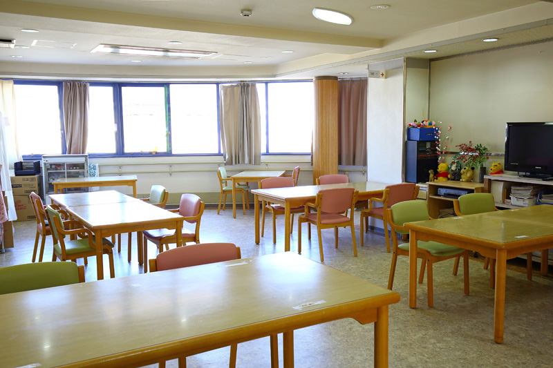 窓が広く光が入り明るい環境のもと、食事時間には、患者様同士、談笑されながら食事をされたり、レクレーションの時間には、患者様と職員が一緒に唄ったりゲームを行ったりとコミュニケーションの場として活用されています。